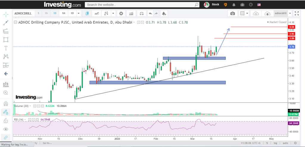 Since the listing of Adnoc Drilling its been trending up, opening price was 2.85Dhs and as of today 20-03-2022 its at 3.78Dhs that is more than 30% increase within 5 months of its listing. Adnoc Drilling is one of the heavily traded stock with big volumes I had also recommended this stock on my YouTube channel if you have missed it the link is here.
